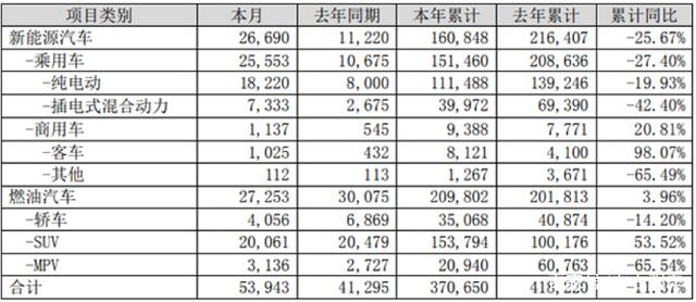 據(jù)比亞迪發(fā)布的11月銷量數(shù)據(jù)顯示,11月銷售新能源汽車26690輛,去年同期為11220輛,銷量同比實現(xiàn)翻番還多,這應(yīng)該是比亞迪今年表現(xiàn)最好的月份。但是,銷量數(shù)據(jù)同時顯示,本年累計銷量160848輛,而去年同期銷量為216407輛,累計同比銷量下滑25.67%。再細(xì)分,在乘用車、純電動、插電式混合動力、轎車、MPV等版塊,比亞迪幾乎全線下滑,僅在商用車、客車、燃油汽車以及SUV領(lǐng)域呈現(xiàn)上漲勢頭。
