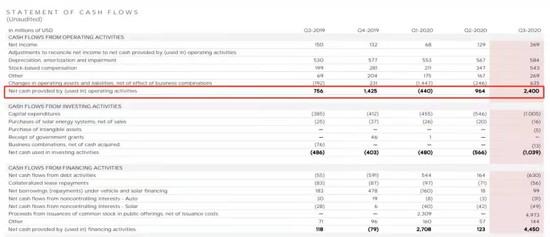 作為一家電動(dòng)車(chē)企業(yè),特斯拉經(jīng)營(yíng)活動(dòng)產(chǎn)生的現(xiàn)金流為正(一季度中國(guó)市場(chǎng)疫情影響導(dǎo)致現(xiàn)金流異常),而且三季度相比去年翻了兩番,這也說(shuō)明電動(dòng)車(chē)業(yè)務(wù)確實(shí)能給特斯拉創(chuàng)造實(shí)實(shí)在在的現(xiàn)金流,并且電動(dòng)車(chē)上的業(yè)務(wù)模式得到了相應(yīng)的資本回報(bào),而不是越賣(mài)越虧。