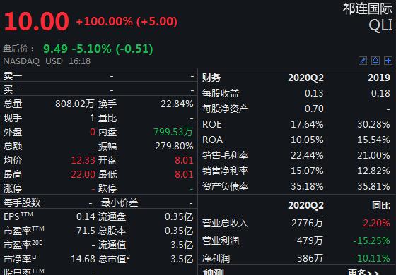 個股方面,中國制藥和化工公司祁連國際周二在納斯達克正式掛牌上市,上市首日收漲100%,股價報10美元,市值3.5億美元。