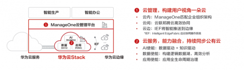 以華為云為例來看,針對客戶智能轉型的需求。華為云Stack重新定義混合云,提供公有云的能力,本地化的部署,從資源混合到能力融合,兼顧公有云快速創新能力和私有云的可管可控,匹配政企組織架構和業務流程,在用戶視角來看就是“一朵云”。