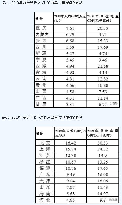 第三,中國東西部發(fā)展不平衡問題依然突出。東西部發(fā)展不平衡是影響我國發(fā)展的重大問題。從電力角度看,西部省份包括了我國主要能源電力輸出省份,在我國西電東送、跨區(qū)跨省電力送出等方面發(fā)揮著重要作用。表1、表2分別給出了西部、東部省份在2019年人均GDP和單位電量GDP兩個維度上的比較。2019年全國人均GDP為7.06萬元,西部省份僅有重慶超過全國平均水平,甘肅、廣西、山西、貴州、云南、青海等西部省份遠低于全國平均水平。2019年全國單位電量GDP平均值為13.64元/千瓦時,西部省份中寧夏、青海、內(nèi)蒙古、新疆和甘肅等省份的該指低于全國平均水平超過50%,甚至75%。可見,我國西部和東部省份在經(jīng)濟發(fā)展水平、電力的經(jīng)濟轉(zhuǎn)化效率等方面存在明顯的不平衡問題。落實電力領域“減碳國際承諾”,必然深刻影響我國電力供給體系,特別是西部以煤電為主的重要電力供給省份的產(chǎn)業(yè)格局、經(jīng)濟發(fā)展,如何將“減碳”轉(zhuǎn)化為促進東西部協(xié)調(diào)發(fā)展、推動西部經(jīng)濟社會高質(zhì)量發(fā)展的歷史機遇,是擺在我們面前的重大歷史命題。實現(xiàn)東西部協(xié)調(diào)發(fā)展也是實現(xiàn)我國第二個百年奮斗目標應有之意。
