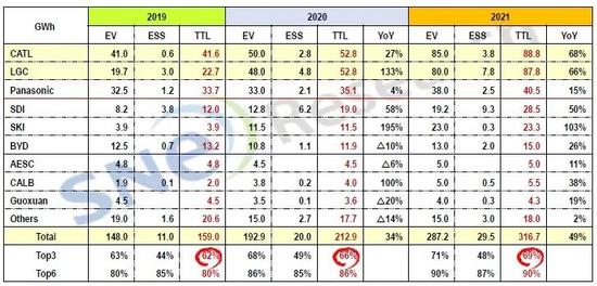 (表中EV即電動車用的動力電池產(chǎn)能,數(shù)據(jù)來自韓國市場調(diào)研機(jī)構(gòu)SNE Research)