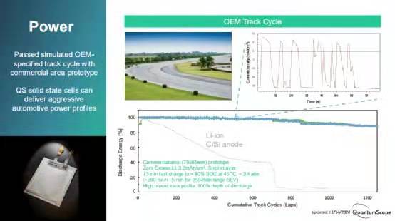 功率:QuantumScape完成了車企指定的90秒1200次工況循環仿真,放電倍率是6C。其中9次循環工程中完成完全放電,然后電池被加熱到45度,在15分鐘完成80% SOC。在130次全放電深度(FDOD)循環測試中,電池損失了約10%的容量。這意味著電池只能持續260次FDOD循環或大約75,000英里的駕駛。PPT上有一條注釋,指出發生在3.4 atm,這可能意味著處于高壓狀態。