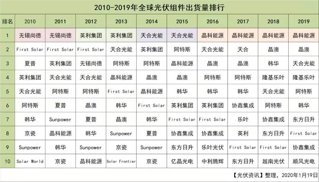 5、最后我們整理了最近十年的光伏組件出貨量排名,供光伏圈的朋友們參考。
