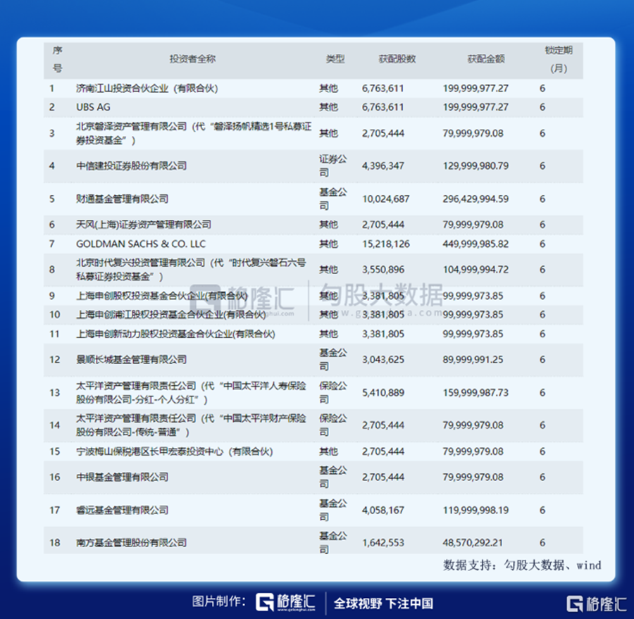 獲配最多的一家機構是境外機構投資者GOLDMAN SACHS & CO. LLC,共獲配1521.8萬股,獲配金額為4.5億元,第二的是財通基金管理有限公司,獲配1002.4萬股,獲配金額2.96億元。景順和睿遠資金較小,在1億以下。