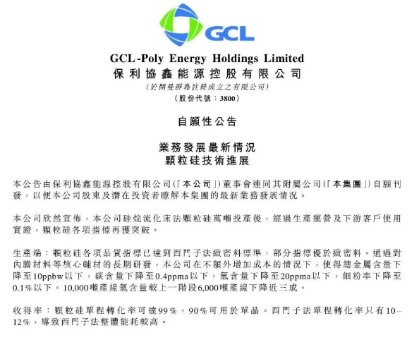 中午,保利協(xié)鑫發(fā)布公告,對(duì)顆粒硅的最新進(jìn)展進(jìn)行了說明,稱顆粒硅各項(xiàng)品質(zhì)指標(biāo)已達(dá)到西門子法致密料標(biāo)準(zhǔn),甚至部分指標(biāo)還優(yōu)于致密料。