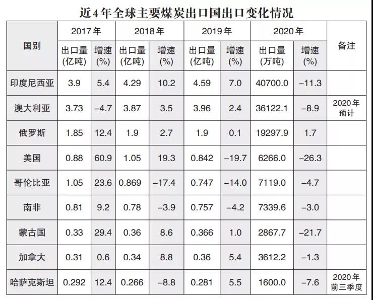 據(jù)介紹,全球煤炭出口量排名第一的印尼,2020年出口煤炭4.07億噸,同比下降11.3%。排名第二的澳大利亞,去年前三季度出口煤炭2.78億噸,同比下降6.0%,預(yù)計(jì)全年出口煤炭3.61億噸,同比下降8.9%。排名第三的俄羅斯,在下半年中國強(qiáng)勁煤炭進(jìn)口需求的拉動(dòng)下,2020年出口煤炭1.93億噸,同比增長1.7%。其他主要煤炭出口國中,美國和蒙古國煤炭出口量下降幅度較大,美國同比下降26.3%,蒙古國同比下降21.7%。