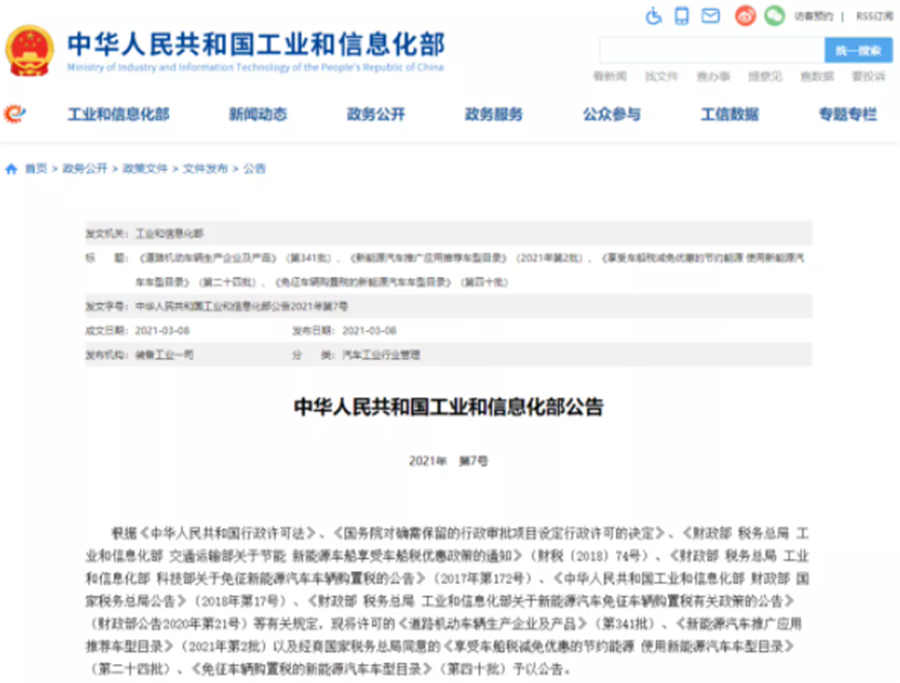 3月8日,工信部通公布了數(shù)個新能源汽車相關(guān)的政策性文件,其中就包括《免征車輛購置稅的新能源汽車車型目錄》(第四十批)。