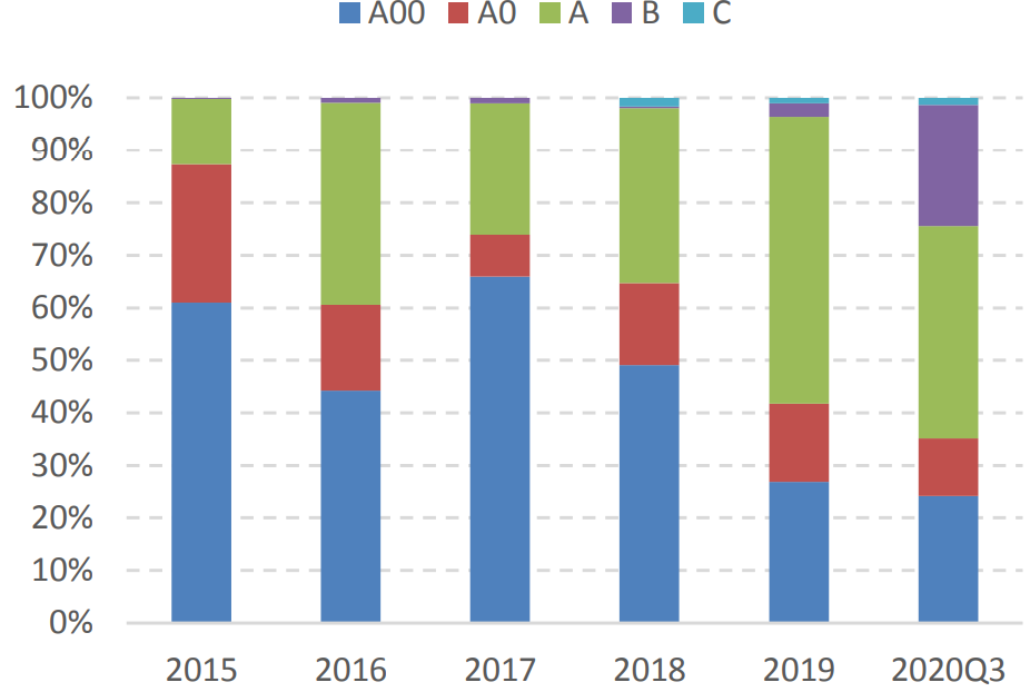 2020年不少自主品牌純電動乘用車一改國貨廉價形象,成功的提高了自身品牌價值,向高端進發,基本告別以往靠A0級撐量的狀態,在毛豆3,漢EV,蔚來ES6和小鵬P7等熱門車型帶動下,純電動B級車份額大幅提升至22%以上,較2019年2.56%提升了近20%。