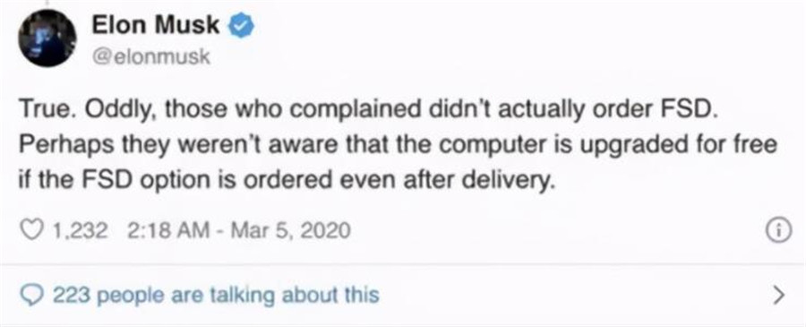 3月5日,埃隆·馬斯克針對硬件縮水事件專門發推,吐槽鬧騰配置的車主根本沒選裝FSD。言下之意便是這些人純屬沒事找事、吹毛求疵。