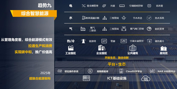 能源結構轉向新一代綜合能源系統。從管理角度看,綜合能源模式會有效拉通生產和消費,助力實現碳中和,推廣價值更高。綜合能源是源-網-荷-儲一體化的自治系統,需要以ICT基礎設施為底座,通過平臺+生態理念,融合創新,提升能源利用效率,降低能源成本。預計2025年,超融合能源架構會大行其道。