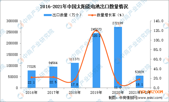 據(jù)中商產(chǎn)業(yè)研究院數(shù)據(jù)庫顯示,2021年2月中國太陽能電池出口量為53929萬個,同比增長18.1%。