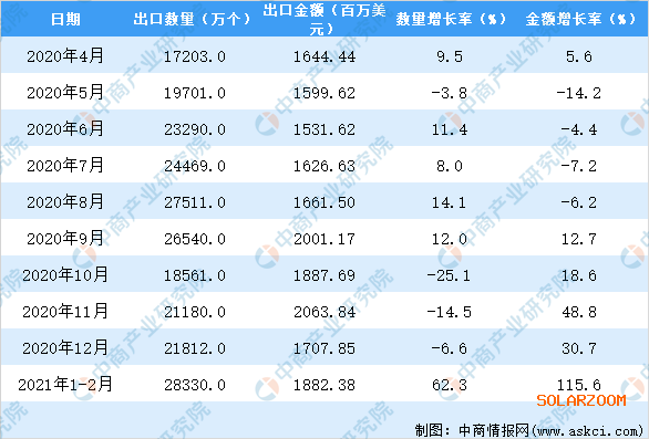 2021年2月中國太陽能電池出口量及金額增長情況
