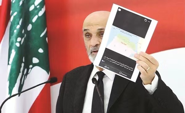 △黎巴嫩力量黨主席賈加在發布會上展示有爭議海域