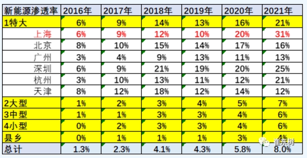 其中以上海為代表,上海2016年新能源車滲透率也是6%的滲透率,但到2020年就達到20%的新能源車滲透率,較2019年大幅提升10個百分點,而且2021年又提升到31%的新能源車滲透率.