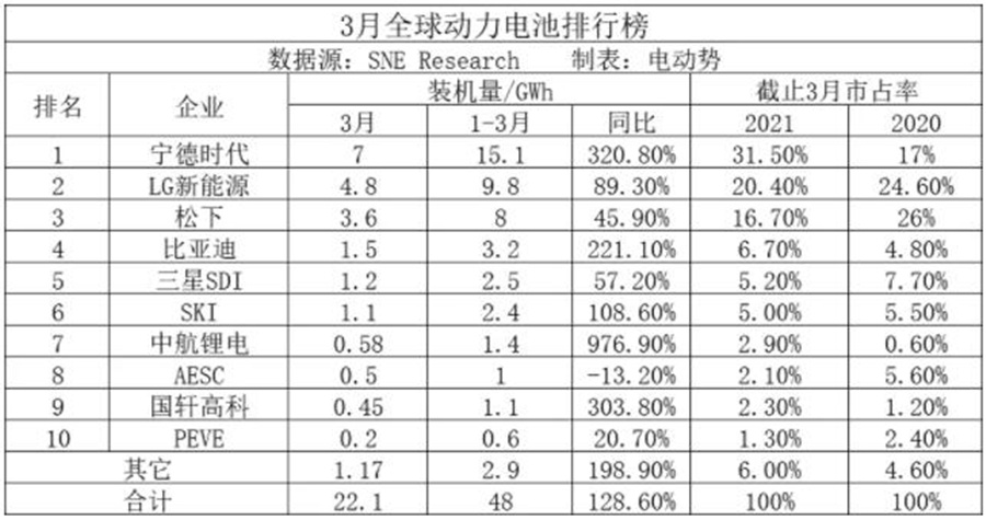 2月全球動(dòng)力電池排行榜那一篇稿子收獲了大量關(guān)注,可見大家對(duì)動(dòng)力電池市場(chǎng)還是比較在意的,這一期我們接著看3月數(shù)據(jù)。五一期間,SNE更新了3月全球動(dòng)力電池裝機(jī)量數(shù)據(jù),這一次我們重點(diǎn)針對(duì)裝機(jī)量和市占率做了下面這個(gè)榜單。