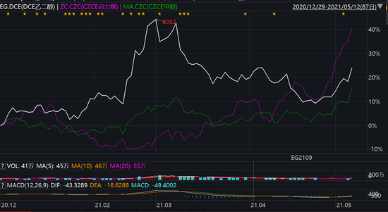 乙二醇此輪反彈從4月底開始,僅半月時間漲幅達到14%,盤面強勢主要受原料煤價格大幅上漲影響。