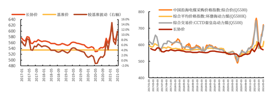 根據(jù)國內主流煤炭企業(yè)公告,2021年長協(xié)煤價基準價為535元/噸為基準價,浮動價參考環(huán)渤海BSPI、秦皇島CCTD、沿海電煤采購價格CECI三大煤炭指數(shù)(各家煤炭企業(yè)選取的參照指數(shù)略有不同)。
