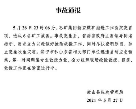 記者從山東省濟寧市微山縣應急管理局獲悉,5月26日23時06分,棗礦集團新安煤礦掘進工作面突發冒頂,造成6名礦工被困。濟寧市和山東省相關部門單位迅速啟動應急預案,第一時間調集專業救援力量,全力組織現場搶險救援。目前,救援工作正在緊張進行中。