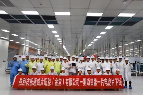 5月28日上午11時18分,在一片歡呼聲中,通威太陽能金堂基地一期項目第一片210PERC電池片順利下線。