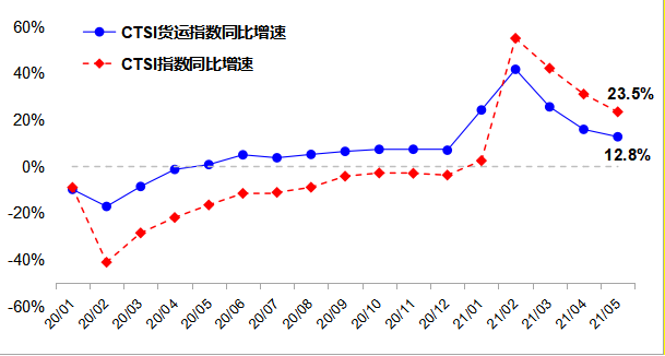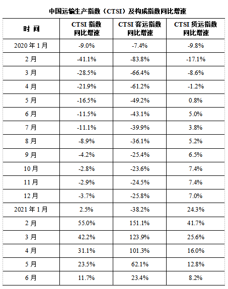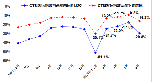 2021年6月,CTSI指數(shù)為171.9點(diǎn),同比增長11.7%,比2019年同期下降1.2%。分結(jié)構(gòu)看,CTSI貨運(yùn)指數(shù)為200.5點(diǎn),同比增長8.2%,比2019年同期增長13.7%,兩年增幅與5月持平;CTSI客運(yùn)指數(shù)為119.2點(diǎn),同比增長23.4%,比2019年同期下降29.8%,兩年降幅較5月出現(xiàn)擴(kuò)大。