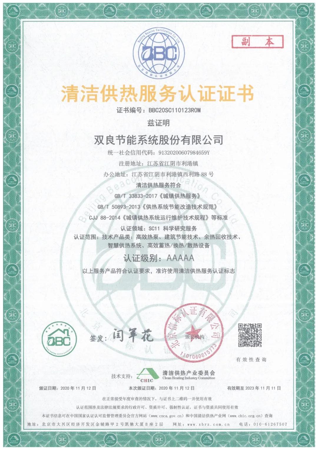 憑借多年在清潔供冷供熱領域的綜合實力雙良節能成為首批中國清潔供熱產業“清潔供熱服務認證”5A級企業。