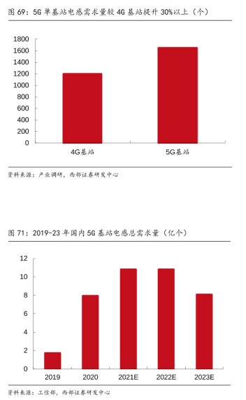 對于磁性元器件行業來說,5G基站和智慧燈桿的大力推廣與發展帶來了很大的市場發展空間,如:射頻電感、功率電感等。根據產業調研、西部證券研發中心的數據顯示,5G基站的電感需求用量將會提升30%以上,電感用量從原來4G基站的1100-1300顆,到如今5G基站的1600-1700顆。而且總需求量也在不斷上升。