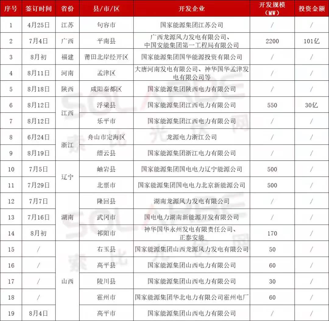 據索比光伏網統計,國家能源集團在8月份發布了24個分布式光伏項目EPC招標,裝機容量合計300MW,大多要求年底前并網。