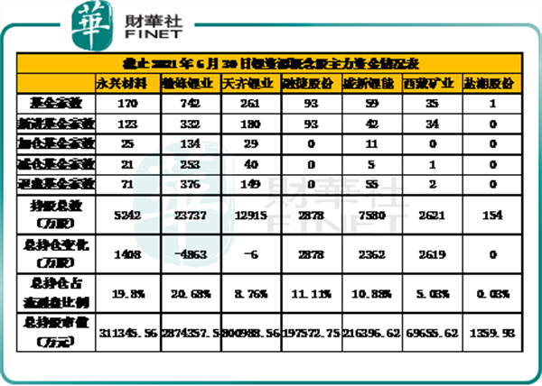 截止2021年6月30日,持倉永興材料的基金公司總共有170家,排名第三,持股綜數5000多萬股,總持倉占流通盤比例為19.8%,從基金總數與持股總數來看,永興材料在主力資金青睞度方面,僅次于贛鋒鋰業與天齊鋰業,具體如下表所示: