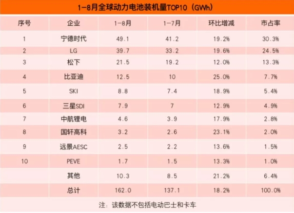 根據(jù)韓國市場研究機(jī)構(gòu) SNE Research 數(shù)據(jù)顯示,1-8 月,LG 能源裝機(jī)量達(dá) 39.7GWh,位居全球動(dòng)力電池裝機(jī)量榜第二。其裝機(jī)量的上漲,得益于特斯拉中國 Model Y、大眾 ID.4 和福特野馬 Mach- E 強(qiáng)勁的銷量。