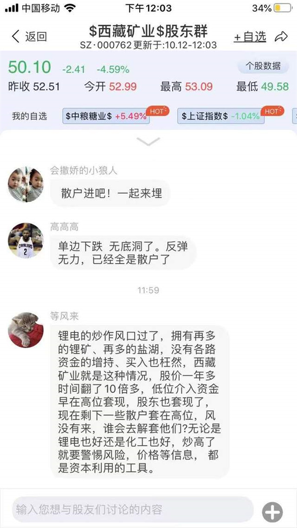 在尺度的西藏礦業(yè)股東群,有投資者稱,鋰電的炒作風(fēng)口過了,擁有再多的鋰礦、再多的鹽湖,沒有各路資金的增持、買入也枉然,西藏礦業(yè)就是這種情況,股價(jià)一年多時(shí)間翻了10倍多,低位介入資金早在高位套現(xiàn),股東也套現(xiàn)了,現(xiàn)在剩下一些散戶套在高位,風(fēng)沒有來,誰會(huì)去解套他們?無論是鋰電也好還是化工也好,炒高了就要警惕風(fēng)險(xiǎn),賽道、價(jià)格等信息,容易成為資本利用的工具。