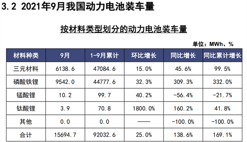 今年9月,我國(guó)動(dòng)力電池裝車量15.7GWh,同比上升138.6%,環(huán)比上升25.0%。其中,三元電池共計(jì)裝車6.1GWh,同比上升45.6%,環(huán)比上升15.0%;磷酸鐵鋰電池共計(jì)裝車9.5GWh,同比上升309.3%,環(huán)比上升32.3%。