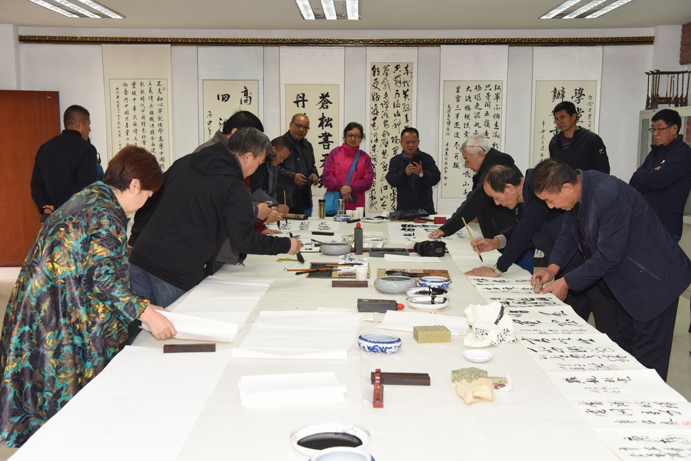 在寬敞亮麗的書畫創作室,大家揮毫潑墨,展開現場創作,有的用楷書、有的用隸屬、有的用行書、有的用草書,根據各自的喜好,創作不同風格的作品,展示各自的書畫功底和技藝。