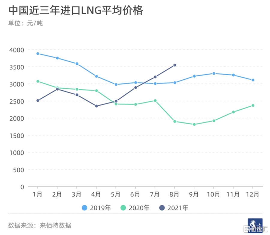 整體來看,今年5月以來進口LNG的平均價格已超過去年同期。此后一路上揚,在7月超過了2019年的同期水平。天然氣咨詢公司來佰特數據統(tǒng)計顯示,8月進口LNG的平均價達到3539元/噸,直逼2019年1月的最高點。