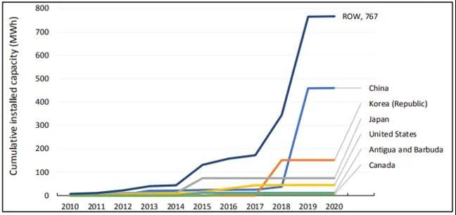 2010-2020年全球液流電池裝機量增長情況(MWh)