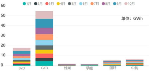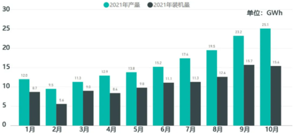 10月份,動力電池產量共計25.1GWh,同比增長191.6%,環比增長8.4%;動力電池裝車量15.4GWh,同比上升162.8%,環比下降1.8%。