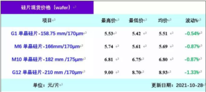 10月下旬,因光伏產業鏈價格持續上漲,終端電站建設需求低迷,硅片出現了小幅下滑的跡象。由于對年末搶裝的預期,硅片價格隨后企穩。