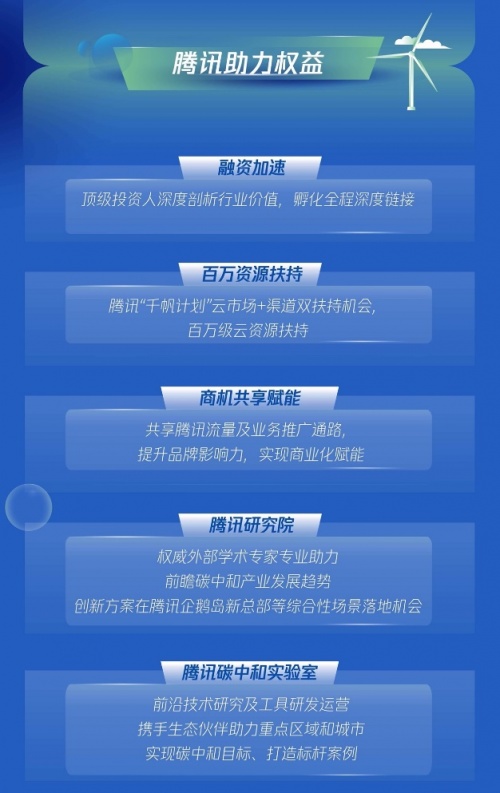 騰訊碳中和加速器是騰訊產業加速器推出的全新賽道,旨在促進社會低碳化與數字化高度融合,助力可持續發展,搭建騰訊與碳中和企業的橋梁。依托騰訊云啟創新生態,為入選成員提供技術、產品、資金、商機等生態扶持,加速碳中和創新企業成長。