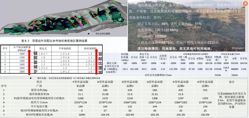 惠星舉例道“西北某100MW電站,選址于5000畝左右的山地,但實際可利用面積僅為2200多畝,在以項目收益率為底線的情況下測算,其適合的融配比在1.5左右,但有限的土地不足以布置更多的直流側裝機。但是,在采用N型組件后,疊加柔性支架技術等多種方案組合,其收益率測算達標。如果不采用方案,該項目可能就推進不下去了。”