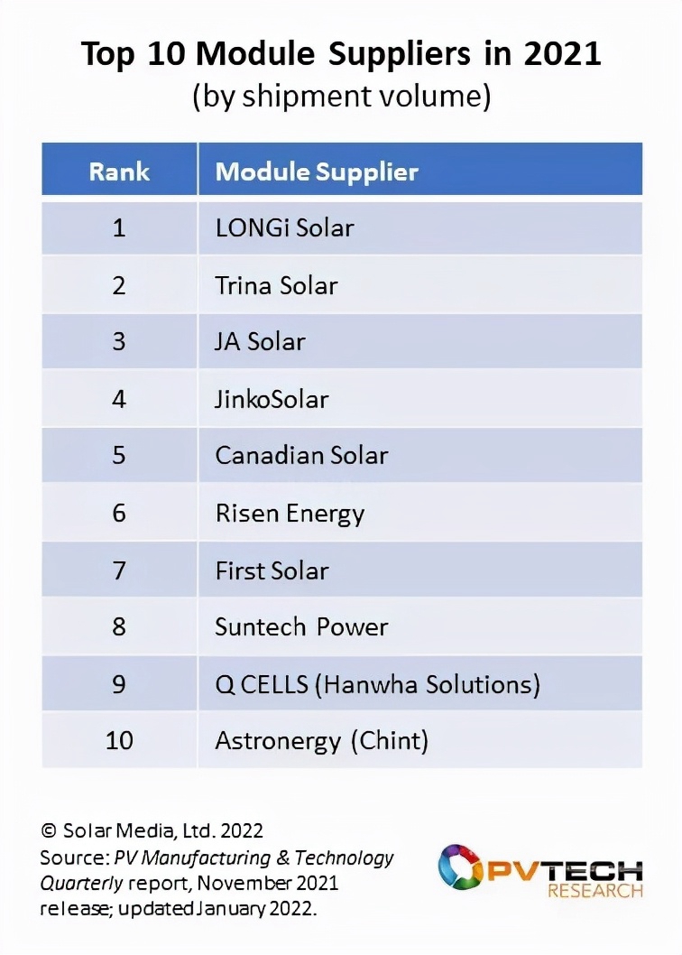 近日,PV-Tech(全球知名光伏媒體)發布了《2021年全球組件供應商top10》。榜單顯示,前十名中我國本土企業占據了7席,且包攬前三名。美國、加拿大、韓國各有1家企業上榜。
