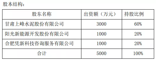 三方擬設(shè)立的合資公司將通過現(xiàn)金方式出資完成,全名為上峰陽光新能源發(fā)展有限公司(下稱“上峰陽光”) 注冊資本5000萬元,注冊地址位于浙江省寧波市北侖區(qū)梅山保稅區(qū)。以下是擬合資企業(yè)的股本結(jié)構(gòu)。