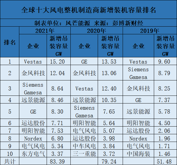 數(shù)據(jù)顯示,2021年全球風(fēng)電新增裝機(jī)99.2GW,為歷史最高水平。其中陸上風(fēng)電裝機(jī)82.3GW,占比83%;海上風(fēng)電裝機(jī)16.8GW,相較于2020年增長(zhǎng)161%。 維斯塔斯(Vestas)以15.2GW的裝機(jī)容量位居第一,與位列第二的金風(fēng)科技之間相距3GW,西門(mén)子歌美颯(Siemens Gamesa)上升兩位位居第三。前三大風(fēng)電整機(jī)制造商裝機(jī)容量合計(jì)占全球市場(chǎng)份額36%。遠(yuǎn)景能源與通用電氣(GE)緊隨其后,分別位列第四、第五。