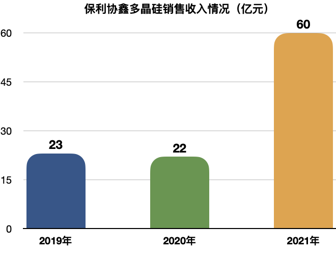 聚焦硅料主業(yè)的科技強(qiáng)企戰(zhàn)略,在其分部收入表中表現(xiàn)得尤為明顯,銷售多晶硅收入在2019年和2020年分別為23億元和22億元,但2021年同比增加170%,達(dá)到了近60億元。