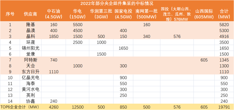 在組件市場格局爭奪戰中,國內與國外分化為兩個完全不同特點的市場。從國內市場來看,央企集采仍然是頭部組件出貨的競爭重點。從2022年一季度已經定標的28.7GW組件集采中,TOP6大組件廠商中標規模19.8GW,占比69%,頭部企業仍然是集采中的領頭羊。