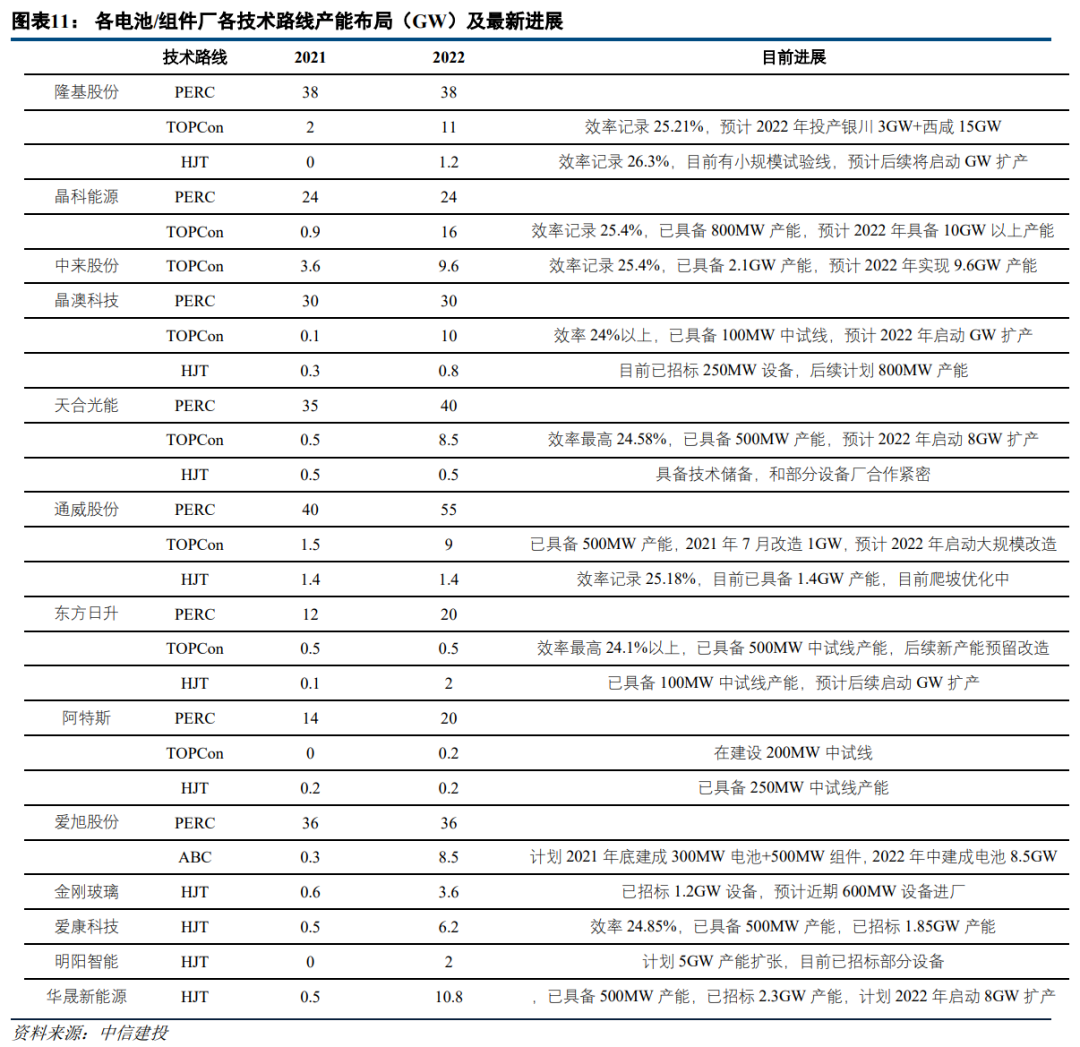 在N型布局方面,天合光能亦是引領者,早在幾年前便以實現出貨。3月10日,其TOPCon效率最高達到25.5%,創造了大面積產業化n型單晶硅i-TOPCon電池效率新世界紀錄。天合光能目前已具備500MW產能,預計2022年啟動8GW擴產。