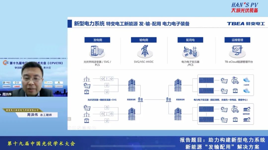 特變電工新疆新能源股份有限公司周洪偉參加此次活動,并發表題為《助力構建新型電力系統,新能源“發輸配用”解決方案分享》主題報告,分享在新型電力系統下,發電側、輸電側、配電側的電力電子裝備解決方案。