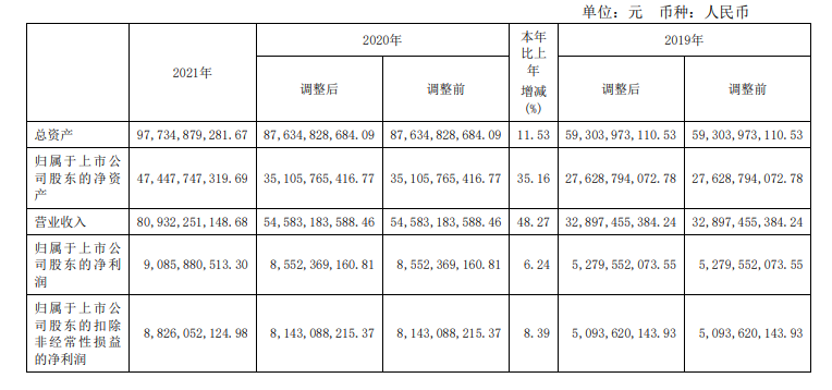 隆基股份2021年年報數據顯示:報告期內,公司實現營業收入809.32億元,同比增長48.27%;實現歸屬于上市公司股東的凈利潤90.86億元,其中歸屬于上市公司股東的扣除非經常性損益的凈利潤88.26億元;綜合毛利率20.19%,資產負債率為51.31%降8.07個百分點。隆基股份表示,2022年計劃實現營業收入超過1000億元。