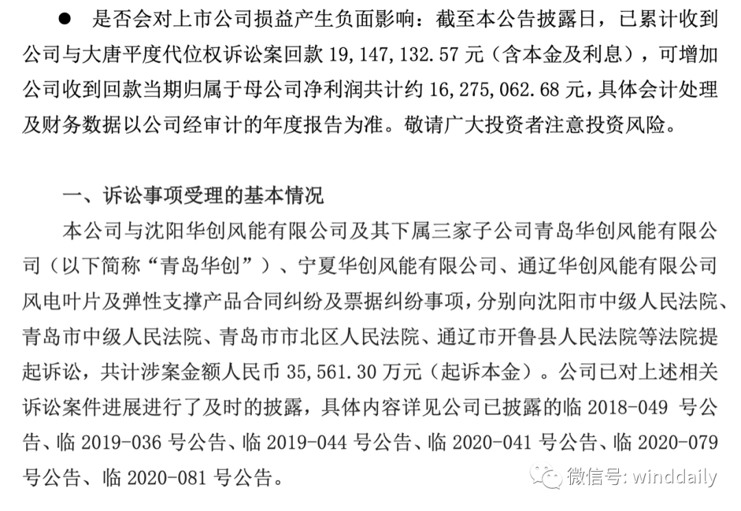 WindDaily獲悉,時代新材因與沈陽華創風能有限公司及其下屬三家子公司青島華創、寧夏華創、通遼華創 風電葉片及彈性支撐產品合同糾紛及票據糾紛而訴至公堂,涉案金額總計 35,561.30 萬元。法院判決:被告大唐平度于判決生效后十日內向原告時代新材支付 18,749,843.5 元;截至目前,時代新材已累計收到 公司與大唐平度代位權訴訟案回款 19,147,132.57 元,結案。公告原文如下: