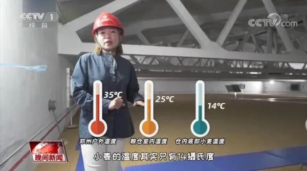 “鄭州戶外溫度是35攝氏度,而這間糧倉內目前的溫度是25攝氏度,而在這個糧倉下,小麥的溫度其實只有14攝氏度,除了厚實的墻體之外,在這里更重要的一個黑科技就是這個,內環流控溫系統,它將冬天儲存在麥堆底部的冷空氣,通過密閉的環流系統輸送至麥堆表面,以此來降低溫度。”