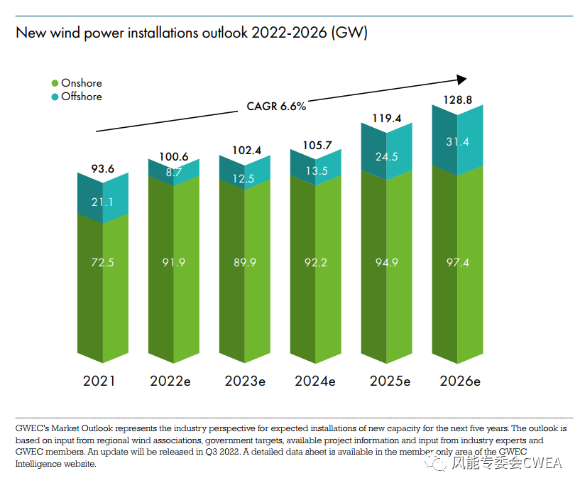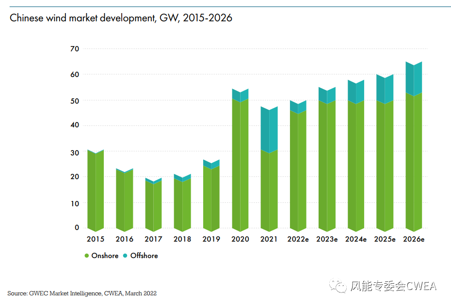 GWEC預測數據顯示,到2026年中國風電年新增裝機將超過60GW,其中陸上風電超過50GW,海上風電超過10GW。
